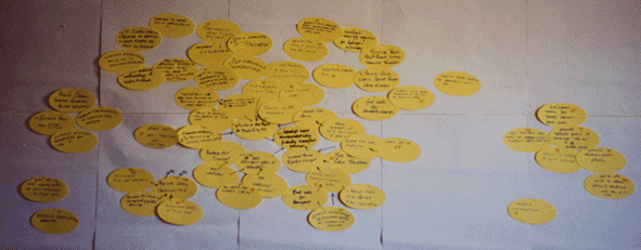 How do I Use OvalMaps?The use of OvalMaps is simple. You start by putting a number of pages of flip-chart paper on the wall to give a continuous paper surface suitable for writing on. Then give each person a number of ovals and a marker pen (see below). When appropriate, people can then write on the OvalMap and use the sticky PostIt® strip to position them on the paper. If it isn't quite right, simply peel and re-apply. When you are happy with the positioning, you can use the marker pen to draw arrows on the background paper from one oval to another. A key benefit you gain from using oval-shaped paper is that people feel comfortable putting them in sensible clusters, and do not constrained to put them in rectangular or hexagonal patterns. The OvalMap product gives you the benefits of ovals with the security of PostIt technology.